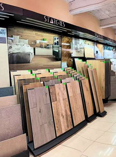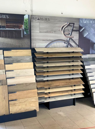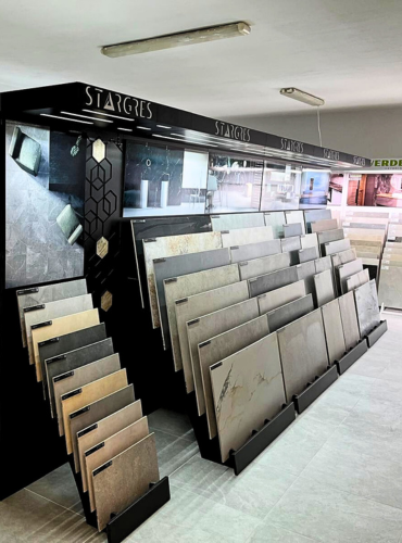 Kompleksowa zabudowa ekspozycyjna wykonana na sali sprzedaży dla marki Stargres. Konstrukcja z płyty MDF, wyposażona w oświetlenie LED oraz panele prezentacyjne z wizualizacjami wnętrz. Projekt umożliwia wygodną prezentację płytek w różnych formatach, łącząc estetykę z funkcjonalnością.