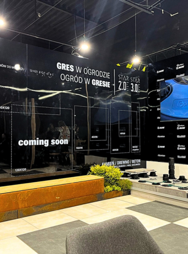 Zabudowa z czarnego laminatu z nadrukiem UV i grafiką architektoniczną, uzupełniona o podesty ekspozycyjne i strefy z roślinnością. Projekt łączy elegancję, funkcjonalność i precyzję wykonania, podkreślając charakter marek premium.