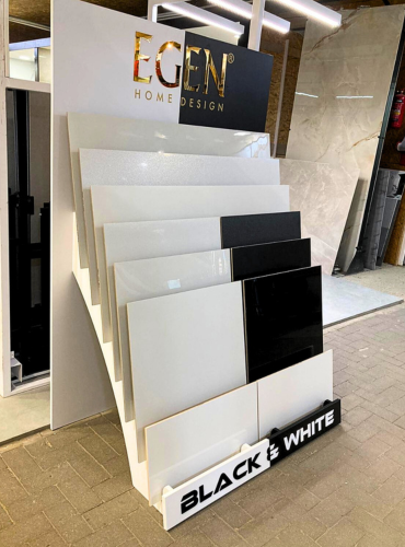 Kompaktowy stojak ekspozycyjny wykonany z wytrzymałego tworzywa PEHD, przystosowany do prezentacji płytek o formacie nawet 120×120 cm.