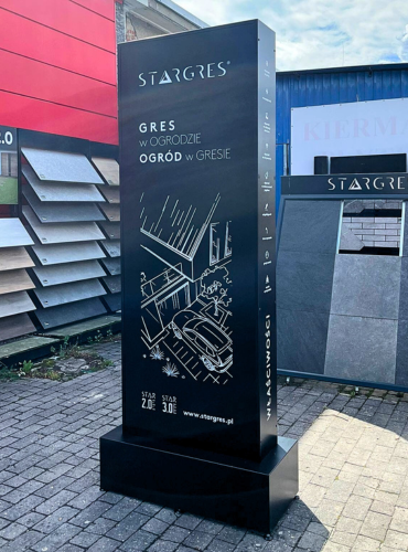 Nowoczesny ekspozytor zewnętrzny, solidna stalowa konstrukcja z nadrukiem UV i minimalistycznym designem podkreśla charakter kolekcji gresów. Projekt łączy estetykę z trwałością.