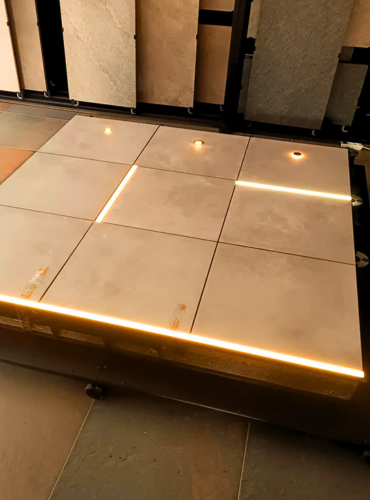 Nowoczesny podest ekspozycyjny wykonany do prezentacji płyt gresowych. Stabilna konstrukcja z wbudowanym oświetleniem LED podkreśla strukturę i kolorystykę materiału. Idealne rozwiązanie do salonów płytek, showroomów i ekspozycji targowych.