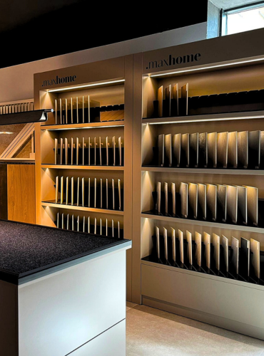 Nowoczesne regały z oświetleniem LED i systemem prezentacji próbek. Precyzyjne wykonanie i minimalistyczny design tworzą elegancką przestrzeń ekspozycyjną w showroomie.