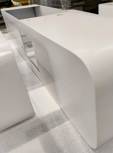 Element konstrukcyjny wykonany z giętej stali, malowany farbą proszkową w kolorze białym. Zaokrąglone krawędzie i idealnie gładka powierzchnia podkreślają precyzję wykonania.