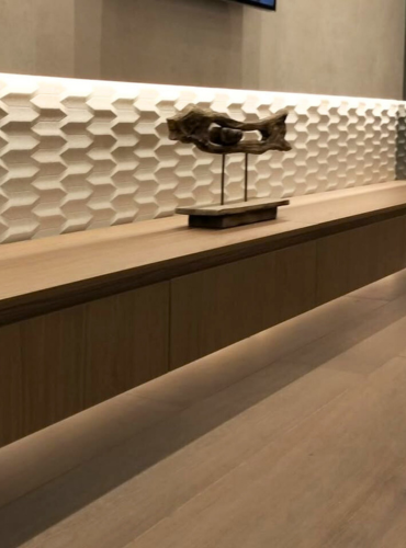 Atrapa komody wykonana z płyty wiórowej laminowanej w dekorze drewna. Element został zaprojektowany jako część zabudowy ekspozycyjnej, zintegrowany z aranżacją ścienną i oświetleniem LED. Precyzyjne wykończenie i nowoczesny wygląd podkreślają jakość wykonania charakterystyczną dla PosProject.